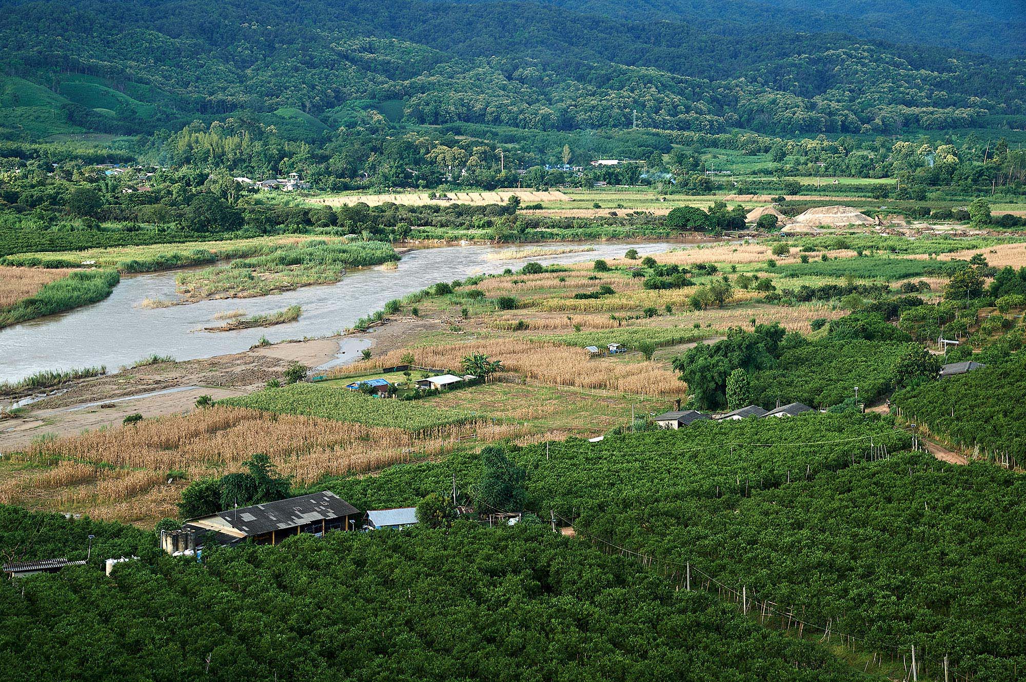 The golden rays of afternoon sunlight penetrate through the overcast sky in the late rainy season and glow over 59-year-old Thip Khaolue’s two-rai riverside field near the Kok River in Mai Mhok Jam village, Mai Ai, the far northern district bordering Chiang Mai province and Myanmar’s Shan State.