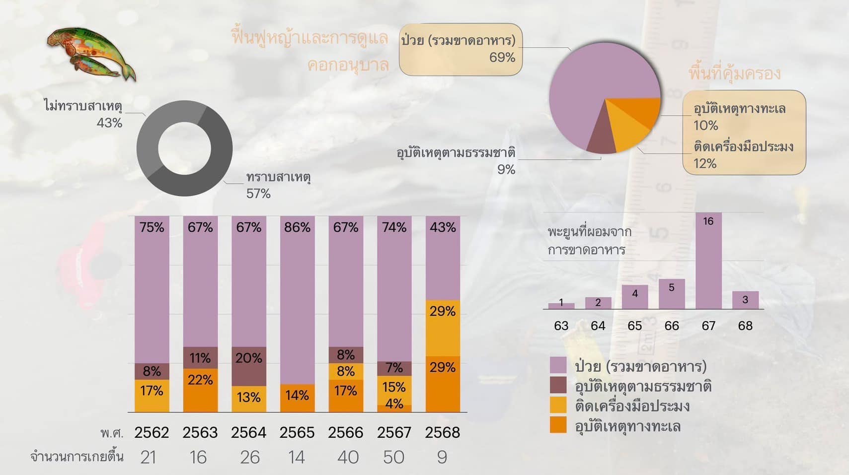 According to a DMCR survey, Thailand had 273 dugongs in its surrounding waters in 2022, mostly living along the west coast in the Andaman Sea. Based on recorded deaths alone, Thailand may have since lost around one-third of that population. The true toll may be even higher, as many carcasses likely go undiscovered.