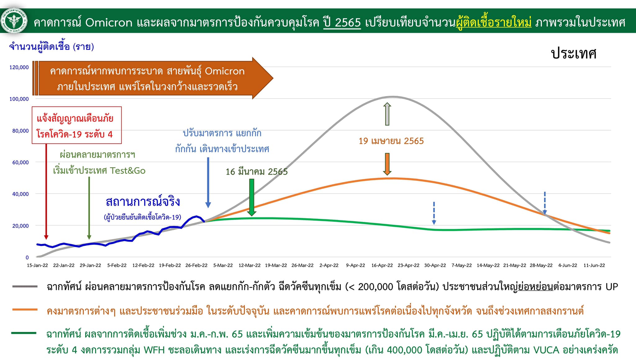 According to the Public Health Ministry’s plan, the country is now in the “Combatting” period, under which the number of infection cases continues climbing and needs to be pushed down. The period would then be followed by the “Plateau” period starting out from mid-April to May, under which the infection rate must be kept stable and slowed down. The Plateau period would then be followed by the “Declining” period when the number of infection cases is pushed down below 1,000 to 2,000, and the last period is the “Post Pandemic”, under which the country is expected to move away from the pandemic and enter an endemic era.